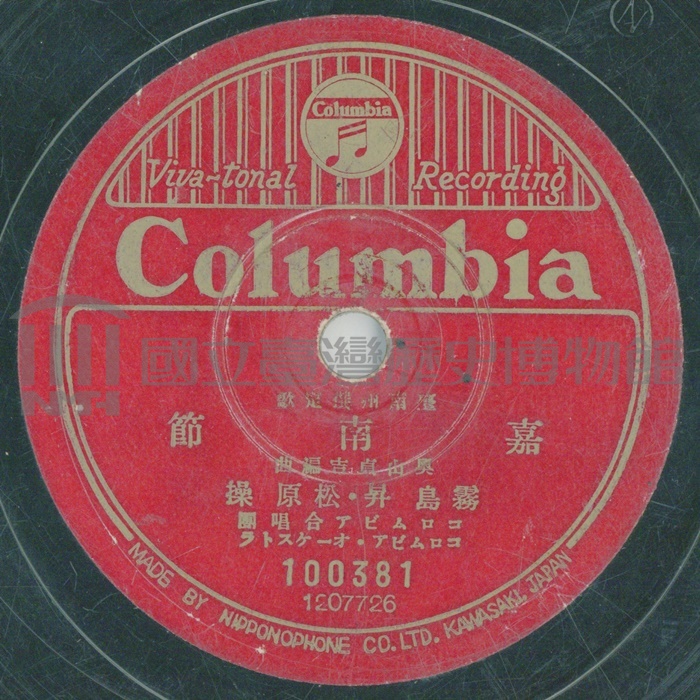 嘉南節 演出者霧島昇、松原操演唱關鍵詞#節慶歌謠 #創作民謠 #地方歌謠內容日本統治時期地方政府募集的日語歌謠,經官方及日本民間機構宣傳。聲音載體留聲機唱片發行編號日本コロムビア (古倫美亞)100381專輯年份《新民謠:嘉南節、豐年節》1941~1942其他曲目B-豐年節來源專案臺史博館藏錄音 歌詞/全文 相關照片