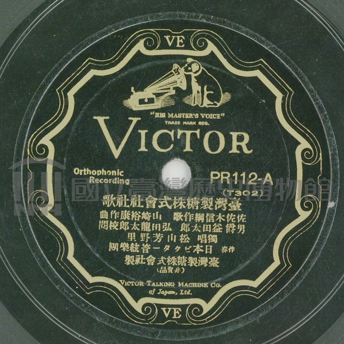 臺灣製糖株式會社社歌 演出者松山芳野里演唱創作者佐佐木信綱作詞 山崎裕康作曲關鍵詞#臺糖 #瑞竹 #裕仁皇太子 #行啟紀念日內容校閱;男爵益田太郎、弘田龍太郎 伴奏:日本ビクター管絃樂團 唱片圓標註明「臺灣製糖株式會社謹製(非賣品)」聲音載體留聲機唱片發行編號日本ビクター (勝利日本本社)PR112其他曲目A-瑞竹之歌 B-臺灣製糖株式會社社歌(鋼琴伴奏) B-行啟紀念日祝歌來源專案臺史博館藏錄音 歌詞/全文 相關照片