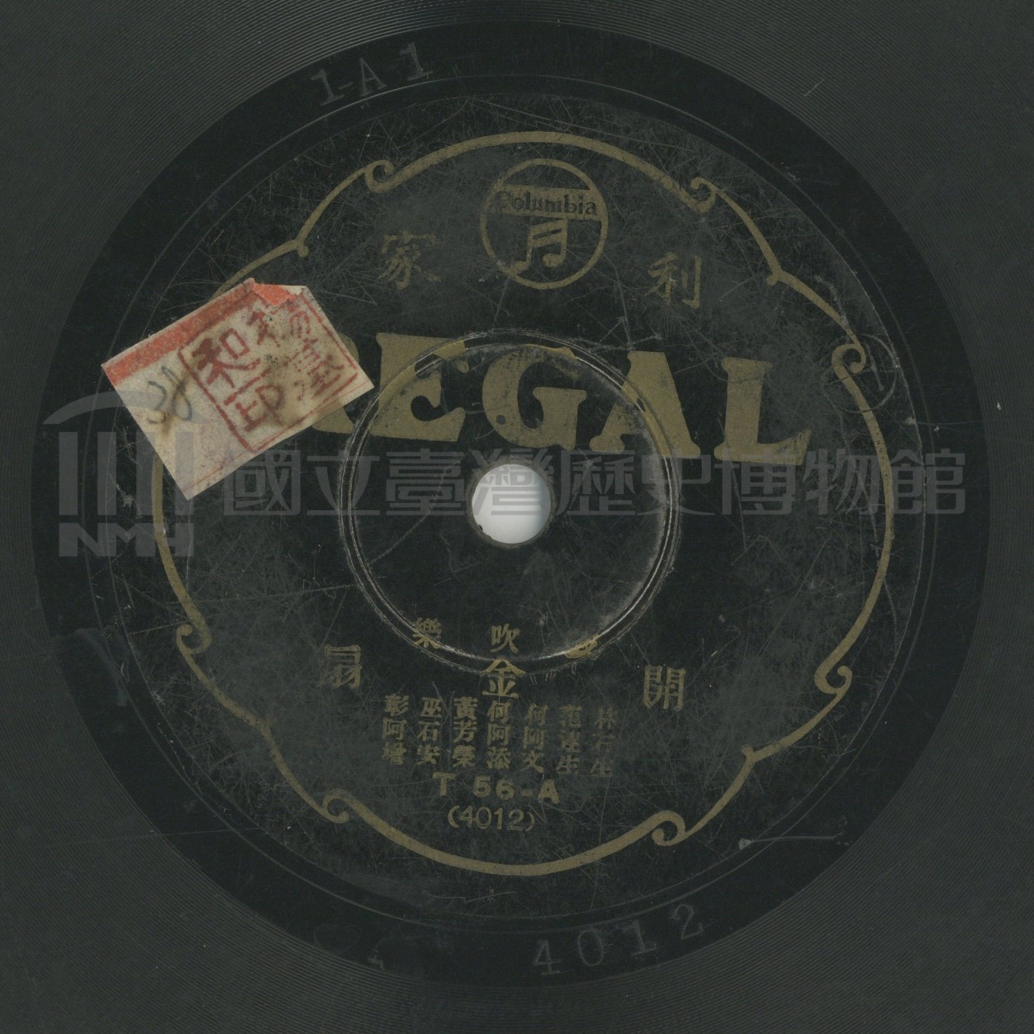 開金扇 關鍵詞#北管 #八音 #鼓吹樂內容八音吹打曲牌,也是知名的客家調。聲音載體留聲機唱片發行編號古倫美亞 (利家-黑)T56專輯年份《鼓吹樂:開金扇、黃大娘》1913錄音發行;1933-34再版專輯資訊為臺灣首批商業錄音之一,日本蓄音器商會1913年邀請臺灣本土藝人前往東京錄製唱片,錄製約120多首發行,內容包括客語的歌謠、三腳採茶戲,臺語的山歌小調、歌仔,八音演奏的節慶小調等等。曲盤圓標註明演出者為「林石生、范連生、何阿文、何明添、黃芳榮、巫石安、彭阿增」,係活躍於新竹苗栗一帶的客家藝人。此唱片為利家商標發行,為1933年之後日蓄公司再版。其他曲目B-黃大娘來源專案臺史博館藏錄音 歌詞/全文 相關照片